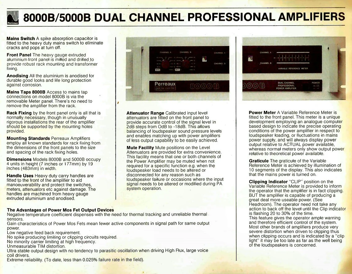 I recently replaced ten, five year old, JBL amplifiers (that had self-immolated) in my favorite local venue, Tilley's, with twentyfive year old refurbished Perreauxs. Why? The Perreauxs are more powerful, far more reliable, at a quarter century old will still have a much longer service life, are sonically vastly superior and are so simple a monkey could be trained to repair one. Unlike the ridiculously complex JBL's they replaced that were inferior by every empirical and subjective measure. I should mention, if you plan to use a professional version of the Perreaux, (6000, 8000, 9000 series) you should bypass the balanced input circuitry and everything associated with it and go straight into the amp boards. This circuitry was absent in the domestic versions. During the 80's, I was doing an average of eight gigs a week in Sydney. Around 1986 I replaced all the Jands J1000 transistor amplifiers in the EV rig I was using with H&H Mosfet amps. I was happy to take the credit for the lush sound that resulted but the real culprits were those Hitachi Mosfets.