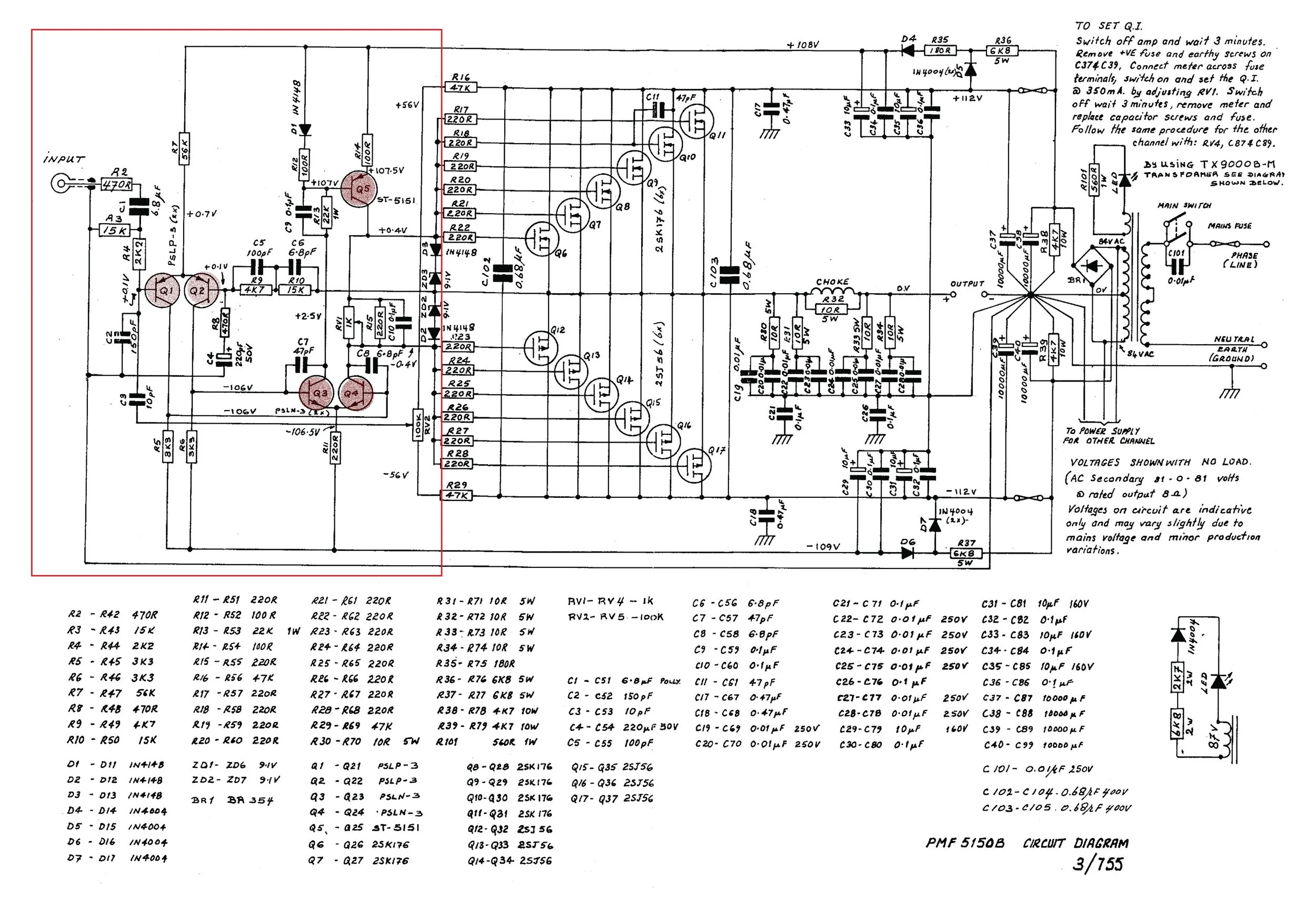 The key to the sonic sophistication of a vintage Perreaux amplifier is not its ridiculously high power or its build quality but its simplicity. Five transistors only are the heart of the circuit. When Hitachi released the Mosfets used as output devices (the device that actually moves the speaker) by Perreaux, Hafler and others, they, like most semiconductor manufacturers, supplied an application circuit. While Perreaux chose to use a variant of this ubiquitous, simple and effective circuit, Hafler reinvented the wheel with their far more complicated iteration; the result being a less reliable, lower powered, competent but sonically lackadaisical product. The red outlined part of the circuit below is common to all older Perreaux amplifiers: